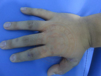 ▲病 史:患者家长主诉,孩子学习压力大,饮食、作息都很不规律,于两年前发现手部出现白斑,治疗效果不佳,今来我院治疗。